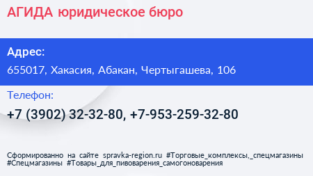 АГИДА, юридическое бюро по адресу 655017, Хакасия, Абакан, Чертыгашева, 106 в дальнейшем Организация, размещена в следующих категориях: