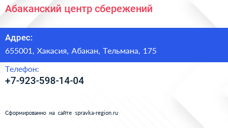 Абаканский центр сбережений по адресу 655001, Хакасия, Абакан, Тельмана, 175 в дальнейшем Организация, размещена в следующих категориях: