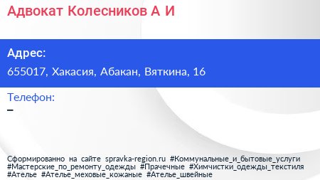 Адвокат Колесников А.И. по адресу 655017, Хакасия, Абакан, Вяткина, 16 в дальнейшем Организация, размещена в следующих категориях: