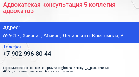 Адвокатская консультация №5, коллегия адвокатов по адресу 655017, Хакасия, Абакан, Ленинского Комсомола, 9 в дальнейшем Организация, размещена в следующих категориях: