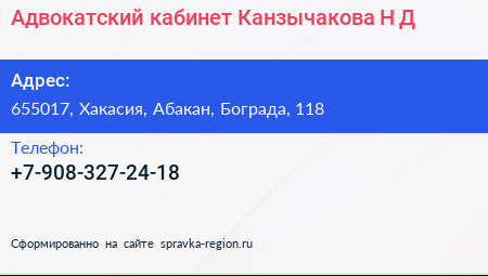 Адвокатский кабинет Канзычакова Н.Д. по адресу 655017, Хакасия, Абакан, Бограда, 118 в дальнейшем Организация, размещена в следующих категориях: