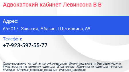 Адвокатский кабинет Левинсона В.В. по адресу 655017, Хакасия, Абакан, Щетинкина, 69 в дальнейшем Организация, размещена в следующих категориях: