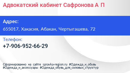 Адвокатский кабинет Сафронова А.П. по адресу 655017, Хакасия, Абакан, Чертыгашева, 72 в дальнейшем Организация, размещена в следующих категориях: