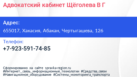 Адвокатский кабинет Щёголева В.Г. по адресу 655017, Хакасия, Абакан, Чертыгашева, 126 в дальнейшем Организация, размещена в следующих категориях: