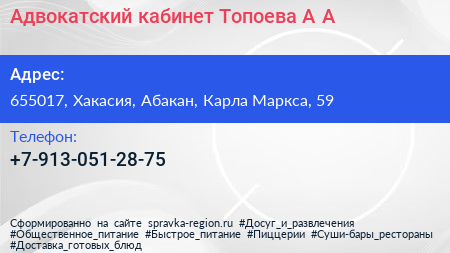 Адвокатский кабинет Топоева А.А. по адресу 655017, Хакасия, Абакан, Карла Маркса, 59 в дальнейшем Организация, размещена в следующих категориях: