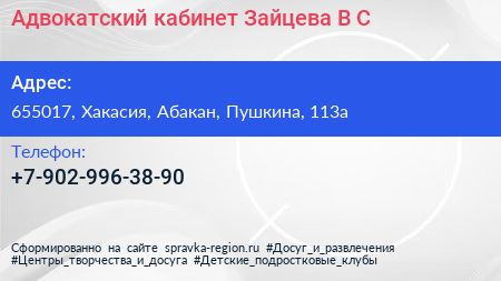 Адвокатский кабинет Зайцева В.С. по адресу 655017, Хакасия, Абакан, Пушкина, 113а в дальнейшем Организация, размещена в следующих категориях: