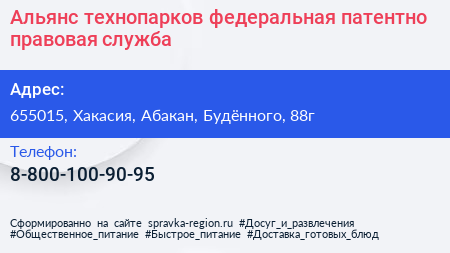 Альянс технопарков, федеральная патентно-правовая служба по адресу 655015, Хакасия, Абакан, Будённого, 88г в дальнейшем Организация, размещена в следующих категориях: