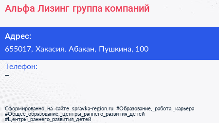 Альфа-Лизинг, группа компаний по адресу 655017, Хакасия, Абакан, Пушкина, 100 в дальнейшем Организация, размещена в следующих категориях: