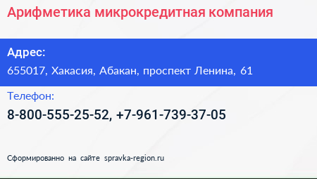Арифметика, микрокредитная компания по адресу 655017, Хакасия, Абакан, проспект Ленина, 61 в дальнейшем Организация, размещена в следующих категориях:
