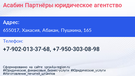 Асабин & Партнёры, юридическое агентство по адресу 655017, Хакасия, Абакан, Пушкина, 165 в дальнейшем Организация, размещена в следующих категориях: