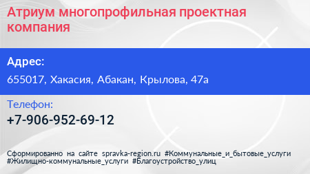 Атриум, многопрофильная проектная компания по адресу 655017, Хакасия, Абакан, Крылова, 47а в дальнейшем Организация, размещена в следующих категориях: