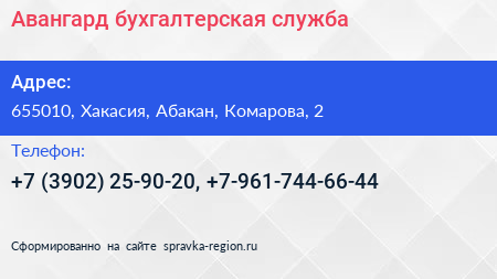 Авангард, бухгалтерская служба по адресу 655010, Хакасия, Абакан, Комарова, 2 в дальнейшем Организация, размещена в следующих категориях:
