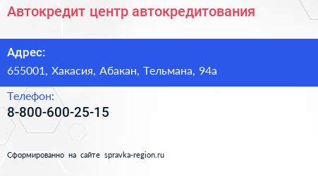 Автокредит, центр автокредитования по адресу 655001, Хакасия, Абакан, Тельмана, 94а в дальнейшем Организация, размещена в следующих категориях:
