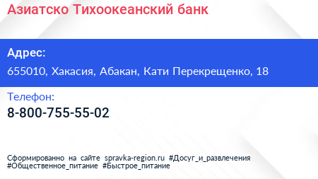 Азиатско-Тихоокеанский банк по адресу 655010, Хакасия, Абакан, Кати Перекрещенко, 18 в дальнейшем Организация, размещена в следующих категориях: