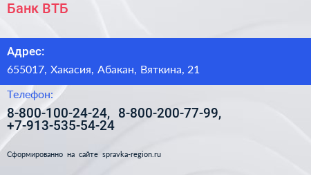 Банк ВТБ по адресу 655017, Хакасия, Абакан, Вяткина, 21 в дальнейшем Организация, размещена в следующих категориях: