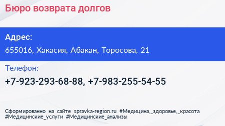 Бюро возврата долгов по адресу 655016, Хакасия, Абакан, Торосова, 21 в дальнейшем Организация, размещена в следующих категориях: