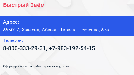 Быстрый Заём по адресу 655017, Хакасия, Абакан, Тараса Шевченко, 67а в дальнейшем Организация, размещена в следующих категориях: