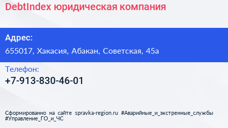 DebtIndex, юридическая компания по адресу 655017, Хакасия, Абакан, Советская, 45а в дальнейшем Организация, размещена в следующих категориях: