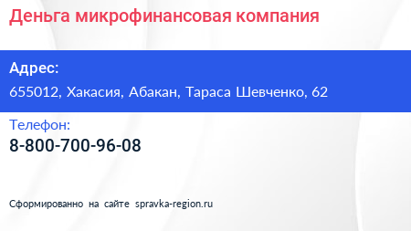 Деньга, микрофинансовая компания по адресу 655012, Хакасия, Абакан, Тараса Шевченко, 62 в дальнейшем Организация, размещена в следующих категориях: