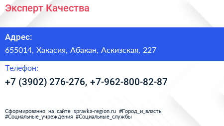 Эксперт Качества по адресу 655014, Хакасия, Абакан, Аскизская, 227 в дальнейшем Организация, размещена в следующих категориях: