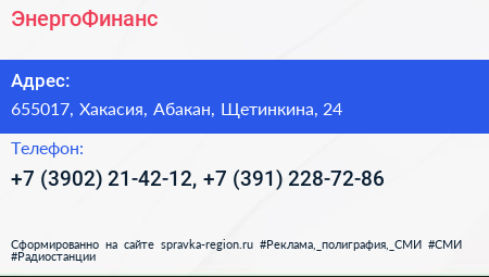ЭнергоФинанс по адресу 655017, Хакасия, Абакан, Щетинкина, 24 в дальнейшем Организация, размещена в следующих категориях: