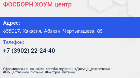 ФОСБОРН ХОУМ, центр по адресу 655017, Хакасия, Абакан, Чертыгашева, 85 в дальнейшем Организация, размещена в следующих категориях: