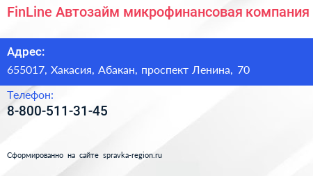FinLine-Автозайм, микрофинансовая компания по адресу 655017, Хакасия, Абакан, проспект Ленина, 70 в дальнейшем Организация, размещена в следующих категориях:
