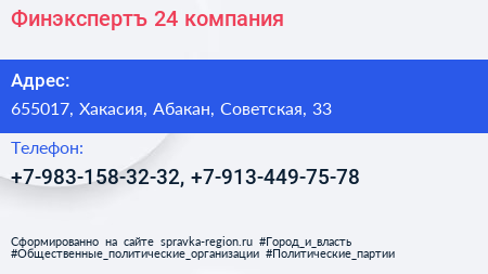 Финэкспертъ 24, компания по адресу 655017, Хакасия, Абакан, Советская, 33 в дальнейшем Организация, размещена в следующих категориях: