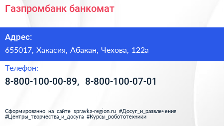 Газпромбанк, банкомат по адресу 655017, Хакасия, Абакан, Чехова, 122а в дальнейшем Организация, размещена в следующих категориях: