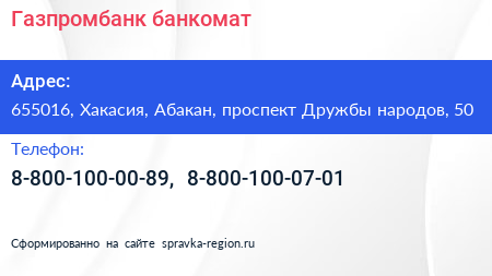 Газпромбанк, банкомат по адресу 655016, Хакасия, Абакан, проспект Дружбы народов, 50 в дальнейшем Организация, размещена в следующих категориях: