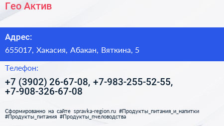 Гео-Актив по адресу 655017, Хакасия, Абакан, Вяткина, 5 в дальнейшем Организация, размещена в следующих категориях: