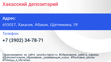 Хакасский депозитарий по адресу 655017, Хакасия, Абакан, Щетинкина, 59 в дальнейшем Организация, размещена в следующих категориях: