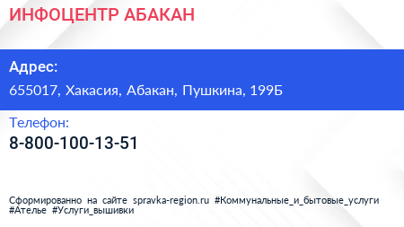 ИНФОЦЕНТР-АБАКАН по адресу 655017, Хакасия, Абакан, Пушкина, 199Б в дальнейшем Организация, размещена в следующих категориях:
