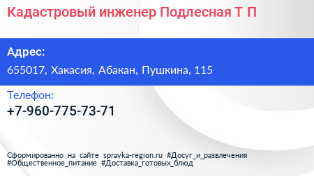 Кадастровый инженер Подлесная Т.П. по адресу 655017, Хакасия, Абакан, Пушкина, 115 в дальнейшем Организация, размещена в следующих категориях: