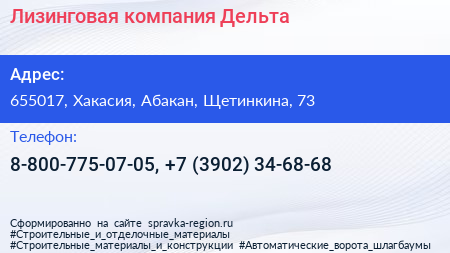 Лизинговая компания Дельта по адресу 655017, Хакасия, Абакан, Щетинкина, 73 в дальнейшем Организация, размещена в следующих категориях: