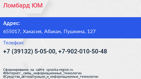 Ломбард ЮМ по адресу 655017, Хакасия, Абакан, Пушкина, 127 в дальнейшем Организация, размещена в следующих категориях: