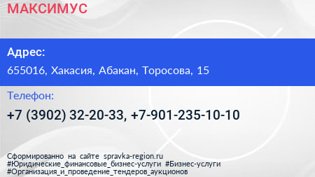 МАКСИМУС по адресу 655016, Хакасия, Абакан, Торосова, 15 в дальнейшем Организация, размещена в следующих категориях: