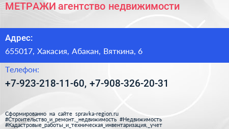 МЕТРАЖИ, агентство недвижимости по адресу 655017, Хакасия, Абакан, Вяткина, 6 в дальнейшем Организация, размещена в следующих категориях: