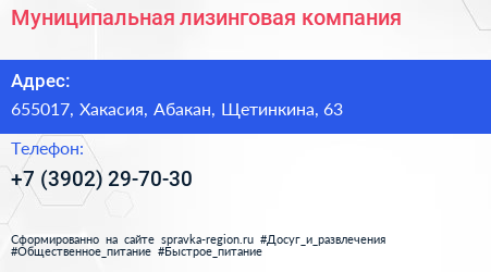 Муниципальная лизинговая компания по адресу 655017, Хакасия, Абакан, Щетинкина, 63 в дальнейшем Организация, размещена в следующих категориях: