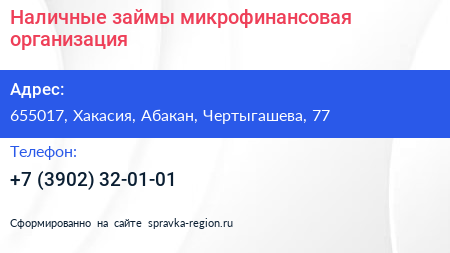 Наличные займы, микрофинансовая организация по адресу 655017, Хакасия, Абакан, Чертыгашева, 77 в дальнейшем Организация, размещена в следующих категориях: