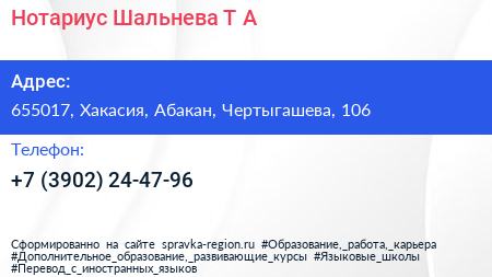Нотариус Шальнева Т.А. по адресу 655017, Хакасия, Абакан, Чертыгашева, 106 в дальнейшем Организация, размещена в следующих категориях: