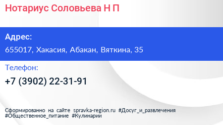 Нотариус Соловьева Н.П. по адресу 655017, Хакасия, Абакан, Вяткина, 35 в дальнейшем Организация, размещена в следующих категориях: