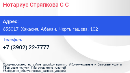 Нотариус Стряпкова С.С. по адресу 655017, Хакасия, Абакан, Чертыгашева, 102 в дальнейшем Организация, размещена в следующих категориях: