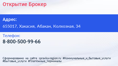 Открытие Брокер по адресу 655017, Хакасия, Абакан, Колхозная, 34 в дальнейшем Организация, размещена в следующих категориях: