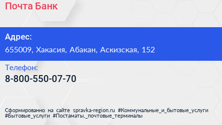 Почта Банк по адресу 655009, Хакасия, Абакан, Аскизская, 152 в дальнейшем Организация, размещена в следующих категориях: