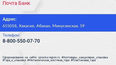 Почта Банк по адресу 655018, Хакасия, Абакан, Минусинская, 59 в дальнейшем Организация, размещена в следующих категориях: