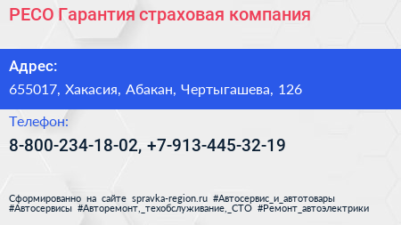 РЕСО-Гарантия, страховая компания по адресу 655017, Хакасия, Абакан, Чертыгашева, 126 в дальнейшем Организация, размещена в следующих категориях: