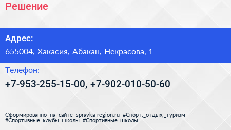 Решение по адресу 655004, Хакасия, Абакан, Некрасова, 1 в дальнейшем Организация, размещена в следующих категориях: