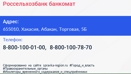 Россельхозбанк, банкомат по адресу 655010, Хакасия, Абакан, Торговая, 5Б в дальнейшем Организация, размещена в следующих категориях:
