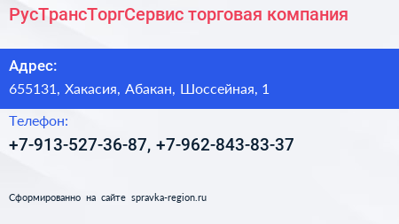 РусТрансТоргСервис, торговая компания по адресу 655131, Хакасия, Абакан, Шоссейная, 1 в дальнейшем Организация, размещена в следующих категориях: